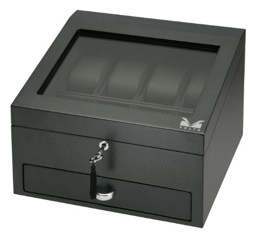 Volta 31-560900, This Volta 8 watch case features a matte carbon fiber finish and a rich black leather interior. With this watch case, you will be able to store 8 of your finest timepieces. The watch case also feautres a see through glass window with beautifully showcases the watches inside. Underneath the watch storage area, you will find an empty drawer which allows you to also store your jewelry or other watches. The watch portion of the watch case can also be locked using the supplied key which will ensure that your expensive timepieces are safe and secure.