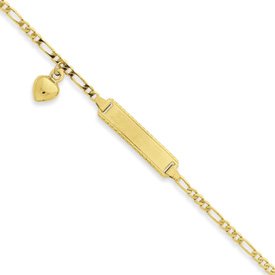 14k 6 Inch Figaro, 14k 6 Inch Figaro Dangling Heart Child ID Bracelet - Lobster Claw - 2.5 Grams in 14k Yellow Gold - Engraveable - Product Attributes: - Lobster Claw Closure - Polished - Engraveable - JewelryWeb Style: QTB52562Y - FREE gift-ready jewelry box