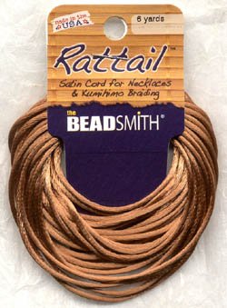Beadsmith , This card consists of 6 yds of coppery brown colored Rattail Satin Cord - the supplier has labeled the color 'Luggage'. The packaging is labeled '2mm', but the actual cord thickness is approximately 1.5mm. This cord card is great to use for Kumihimo braiding and other jewelry projects utilizing colorful cord.